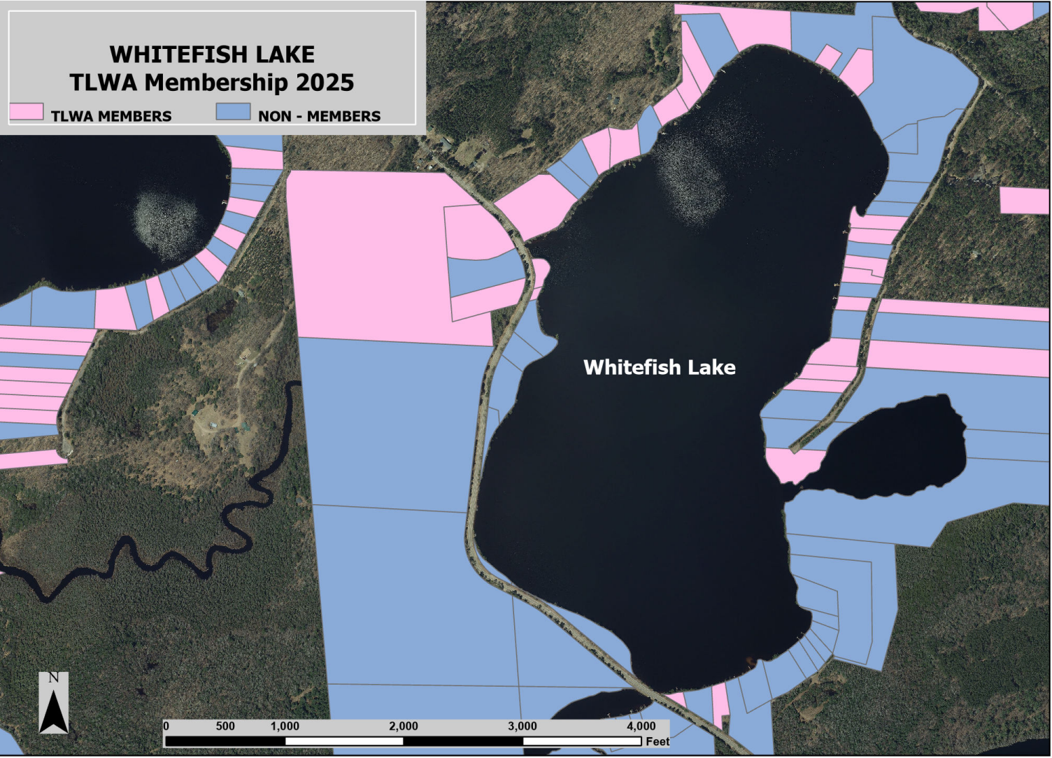 Waterfront land parcels from the Oneida County Land Records are color coded to represent TLWA Membership status as of May 2023. These maps were generated as a visual guide to TLWA participation within the Three Lakes Chain. They became a tool for the Membership committee, Lake Captains, shoreline monitors, and neighbors to assist in identifying under-represented areas where new members could be sought out and encouraged to join.